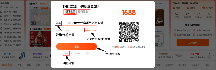 1688 앱이 있다면 우측의 QR코드를 스캔하여 빠르게 로그인할 수 있습니다.