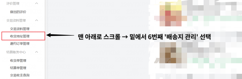 좌측 메뉴를 스크롤하여 收货地址管理 (배송지 관리) 를 클릭합니다.