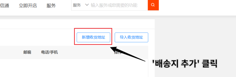 배송지 목록 화면에서 우측 상단의 新增收货地址 (배송지 추가) 또는 导入收货地址 (배송지 가져오기) 버튼을 클릭합니다.