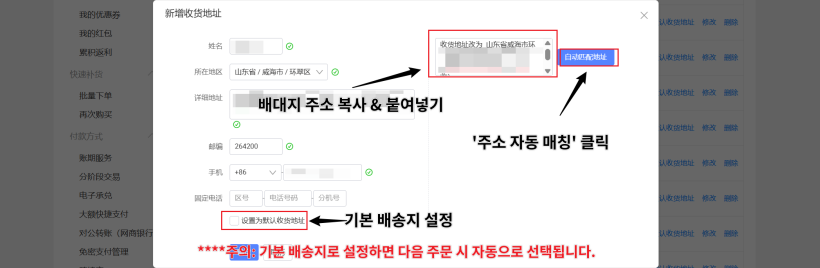 - 设置为默认收货地址 (기본 배송지로 설정) 을 체크합니다